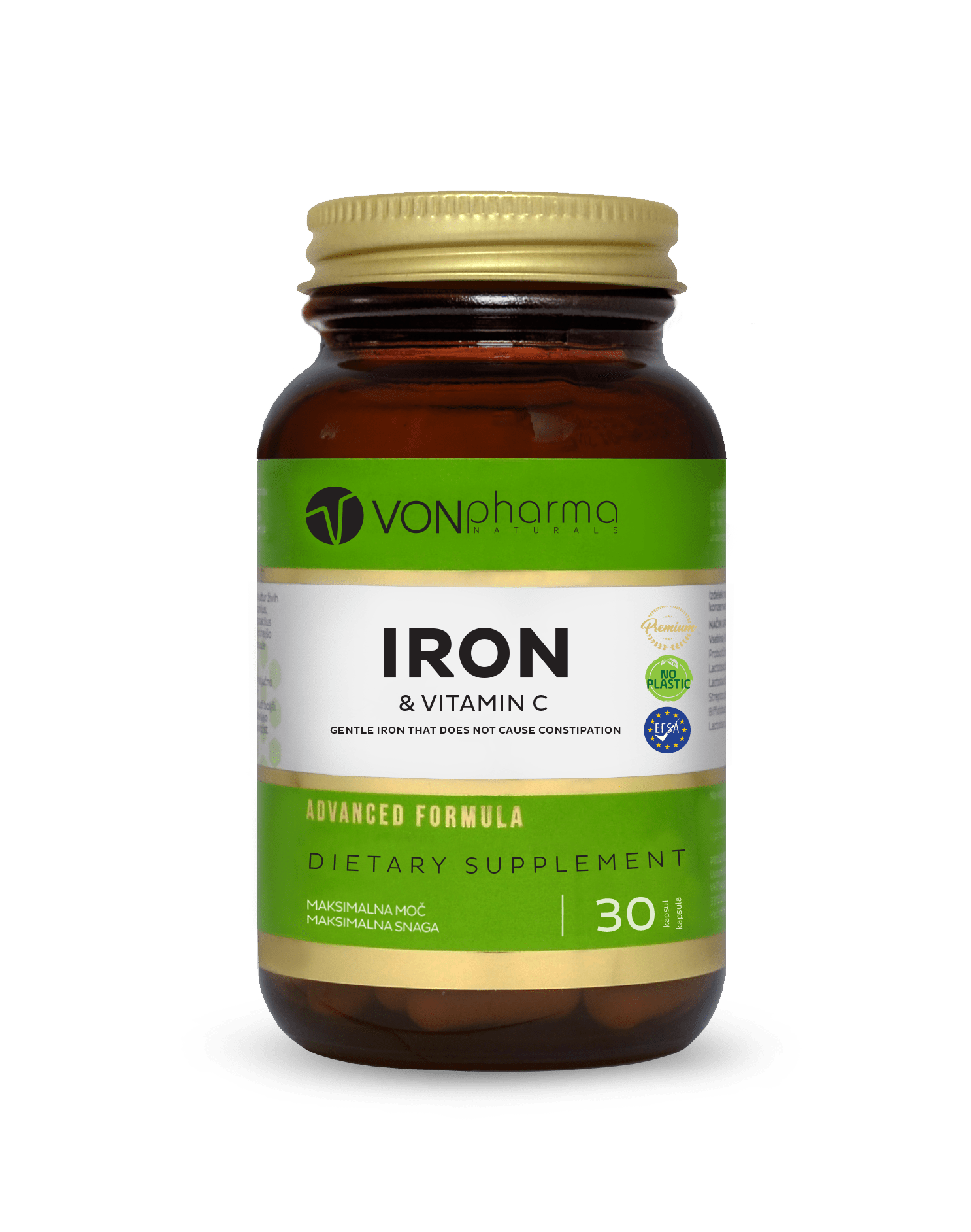 VONpharma ŽELEZO & VITAMIN C za odrasle je visokokakovostno dopolnilo, ki vsebuje železov bisglicinat, inovativno obliko železa, ki ga odlikuje visoka biološka vrednost ter zelo dobra biorazpoložljivost in je dokazano prijazno do prebavil. Ta oblika (v primerjavi z železovim sulfatom) ima od 70 do 75-odstotno boljšo absorpcijo železa in 4-krat večjo biorazpoložljivost, kar zagotavlja večjo koncentracijo železa v telesu.